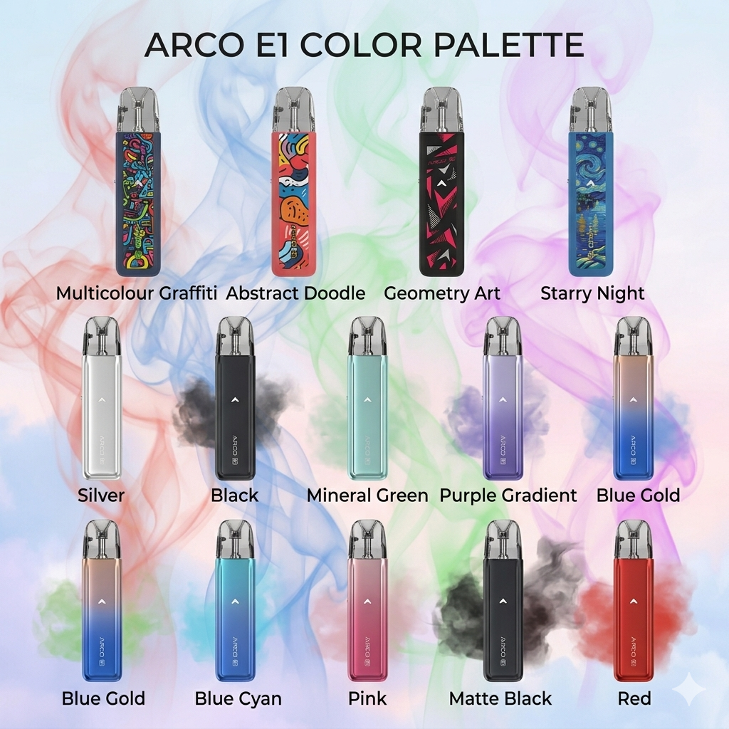 The SMOK ARCO E1 Pod System Kit delivers a sleek, efficient, and highly portable vaping experience designed for both new and experienced users. Powered by a robust 1300mAh battery, it supports up to 30W max output, offering solid performance in a compact form. Paired with a 3ml top-fill pod and optimized for smooth MTL or RDL draws, the ARCO E1 is perfect for vapers seeking simplicity and reliability in a modern pod device.